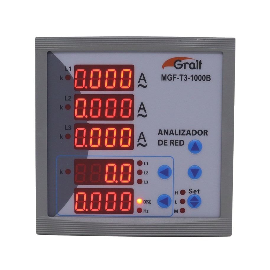 Dispositivo diseñado para monitorear y visualizar parámetros eléctricos en redes trifásicas, tales como voltaje, corriente, frecuencia y factor de potencia. Permite la configuración para sistemas de 3 o 4 hilos y admite la configuración de relaciones de transformación de corriente y tensión para ampliar el rango de medición según la demanda real.
