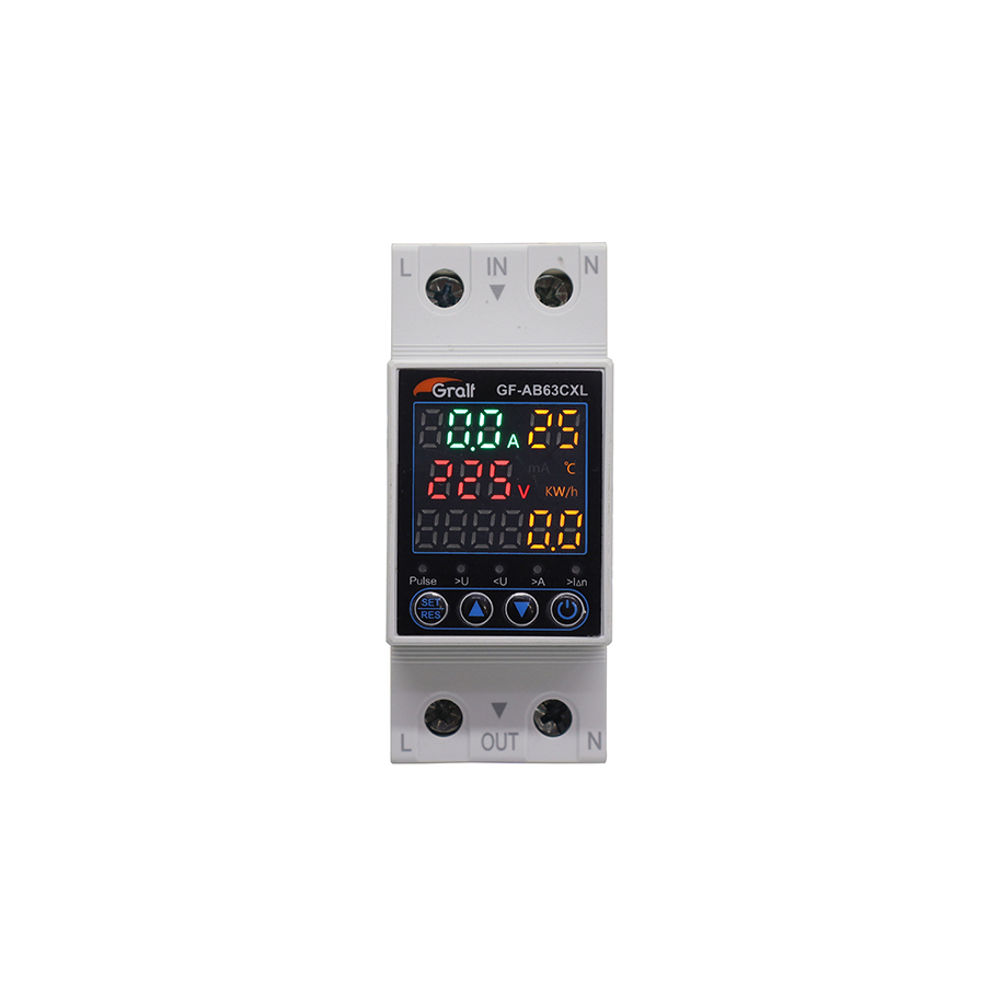 Protector de tensión monofásico configurable, diseñado para proteger cargas ante sobretensión, subtensión, sobrecarga y corriente de fuga. Incorpora cuatro displays digitales que muestran tensión, corriente, corriente de fuga y consumo acumulado. La configuración se realiza mediante teclas dedicadas, y cuenta con medidor de energía reseteable.